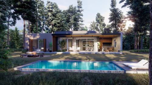 Desarrollada en una única planta, un ala transversal concentra el área privada que comprende un dormitorio con baño en suite, vestidor y dos dormitorios de chicos con baño independiente. El área social se desarrolla en continuidad con la galería integrada tanto visual como funcionalmente. Destaca la flexibilidad del espacio de estar y comedor con el área de cocina incorporada y su isla. Desde el exterior se genera una comunicación secundaria con el espacio flexible de guardado, el lavadero y el sector de parrillero que se integran a la casa desde el sector de servicio.