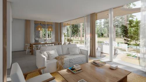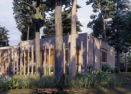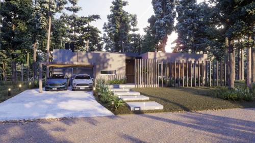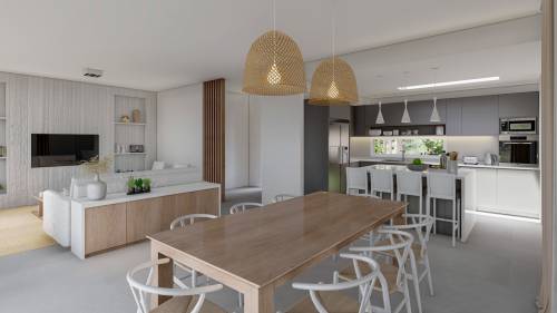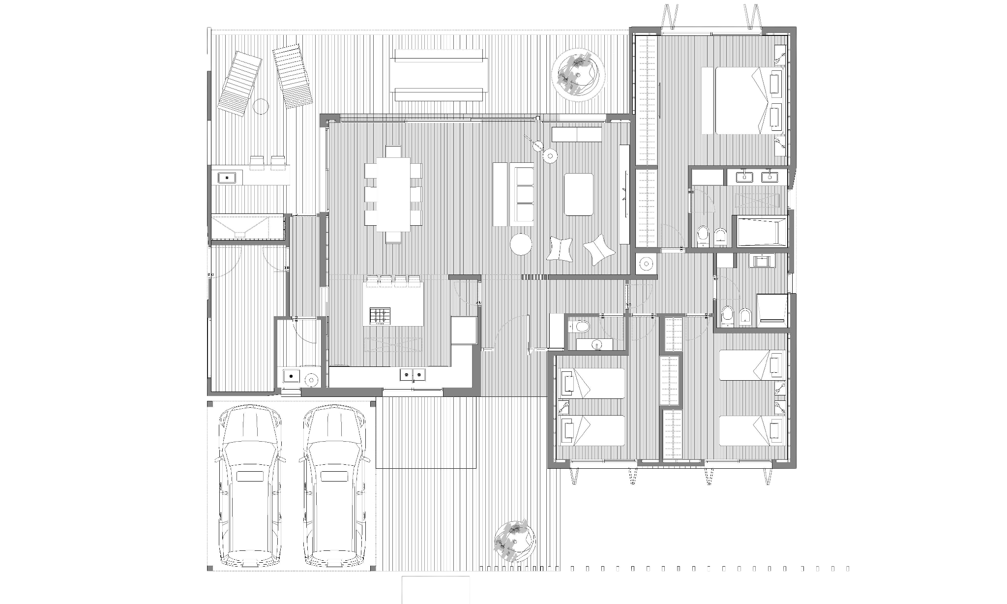 Desarrollada en una única planta, un ala transversal concentra el área privada que comprende un dormitorio con baño en suite, vestidor y dos dormitorios de chicos con baño independiente. El área social se desarrolla en continuidad con la galería integrada tanto visual como funcionalmente. Destaca la flexibilidad del espacio de estar y comedor con el área de cocina incorporada y su isla. Desde el exterior se genera una comunicación secundaria con el espacio flexible de guardado, el lavadero y el sector de parrillero que se integran a la casa desde el sector de servicio.