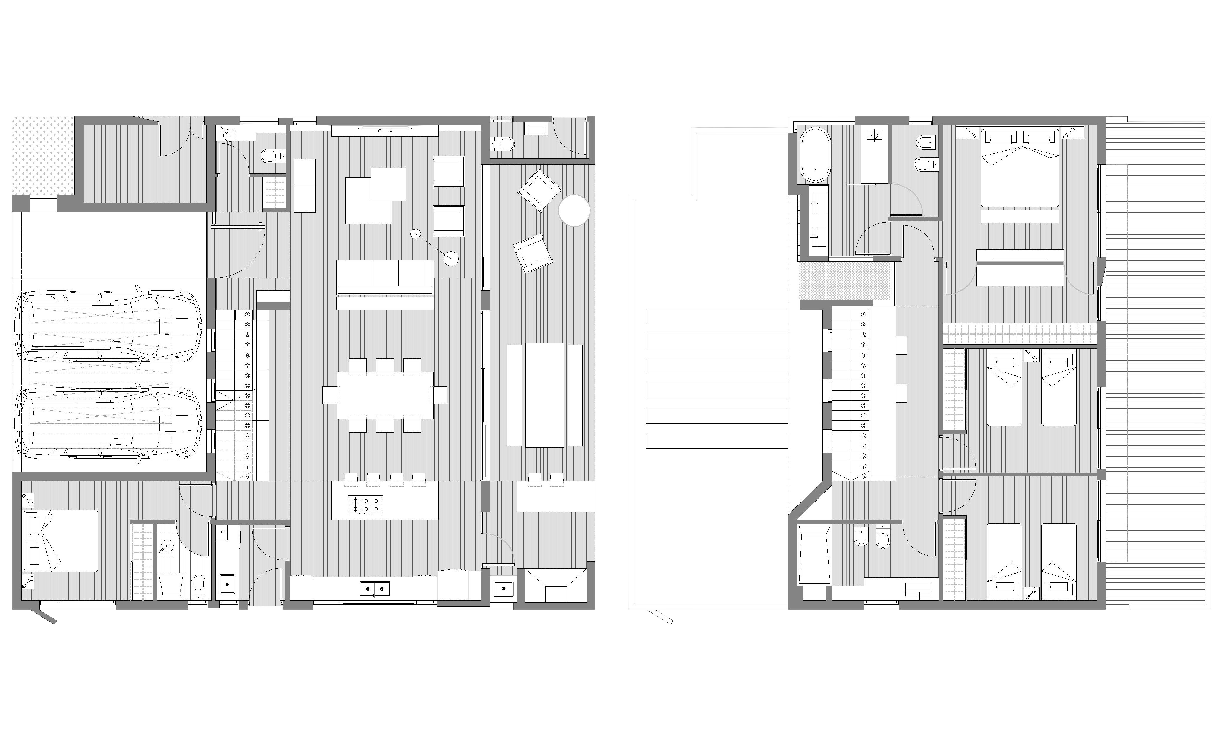 En Planta Alta, las áreas privadas. Tanto el dormitorio principal con vestidor y baño en suite de vista abierta al jardín privado como el área de dormitorios de chicos con baño independiente, cuentan con salida a la terraza con vistas al verde. El aporte de luz cenital sobre el espacio de trabajo generado en paralelo al desarrollo de la escalera, genera una espacialidad particular.