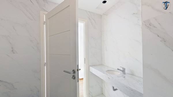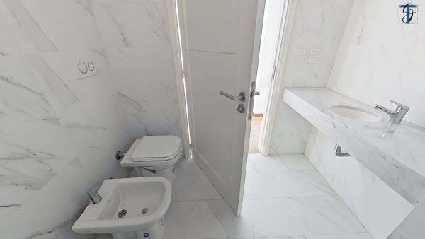 - Baño completo con amplia mesada en cuarzo Calacata, Inodoro Corto Y Bidet Ferrum línea Bari.